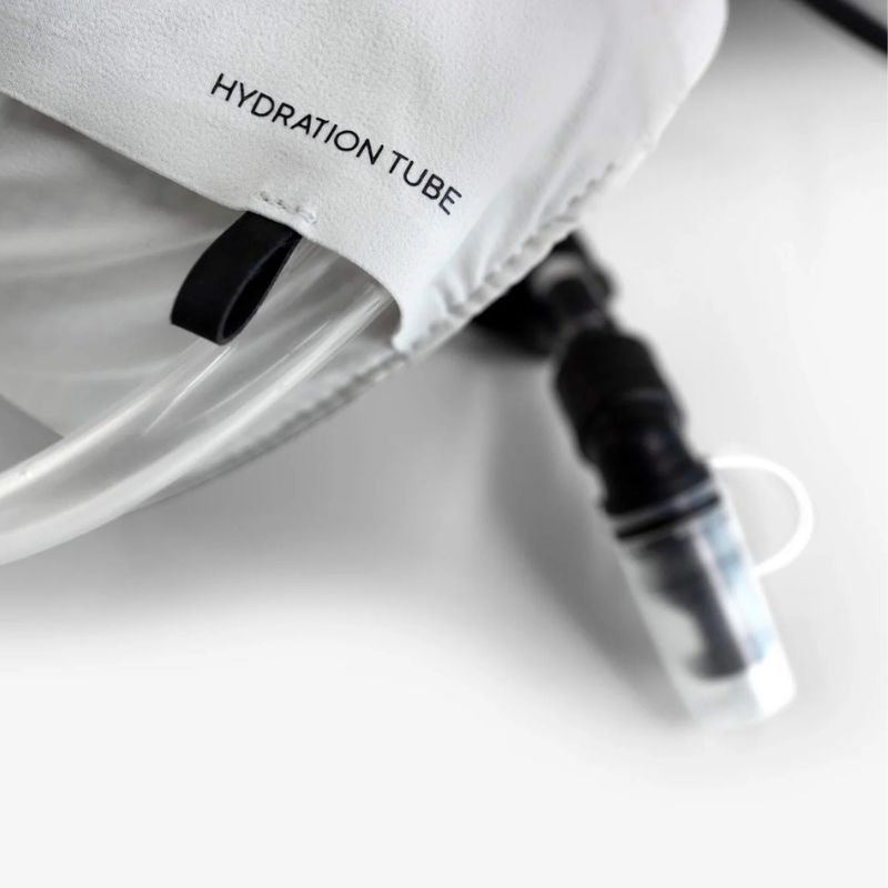 Der Trinkschlauch wird über einen Magnetmechanismus am rechten Schultergurt im Halbbogen umgelenkt und fixiert – für müheloses Trinken während der Fahrt. Das Brustgurtsystem ist in Höhe und Weite individuell einstellbar. Eine Lampenhalterung auf der Rückseite sowie reflektierende Elemente sorgen für Sichtbarkeit in der Dämmerung und Dunkelheit.