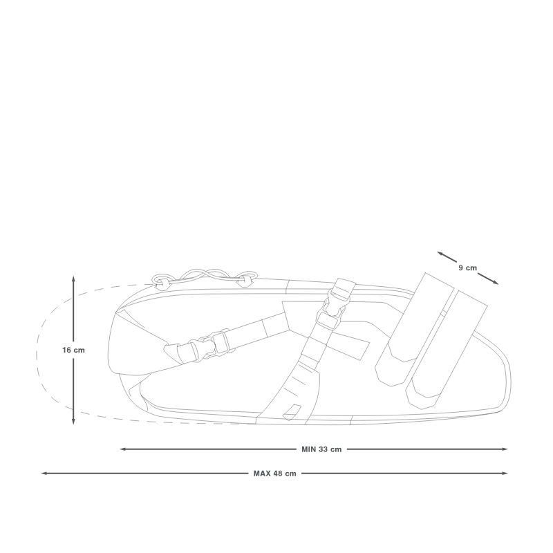 Der Expedition Saddle Pack ist in drei Größen für lange, kurze und längere Abenteuer erhältlich. Darüber hinaus ermöglicht das herunterrollbare Kompressions- und Verschlusssystem, dass das Volumen der Tasche genau an die unterschiedlichen Packanforderungen angepasst werden kann.