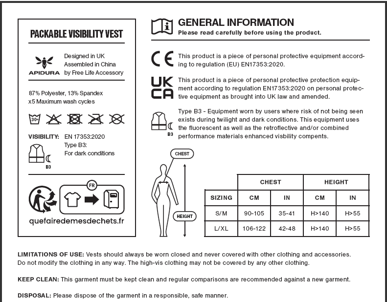 Die verstaubare Warnweste ist EN 17353-konform. EN 17353:2020 Typ B3 ist die europäische Norm, die bei einigen Audax- und Ultradistanzveranstaltungen vorschreibt, dass für die Teilnahme ein Kleidungsstück mit Sichtbarkeit bei Nacht erforderlich ist (z. B. Paris-Brest-Paris). Diese Norm umfasst die älteren Normen EN 1150 und EN 20471, auf die sich Veranstalter manchmal beziehen. Durch die Erfüllung der Norm EN 17353:2020 Typ B3 ist die verstaubare Warnweste für den Einsatz bei Nacht zertifiziert.