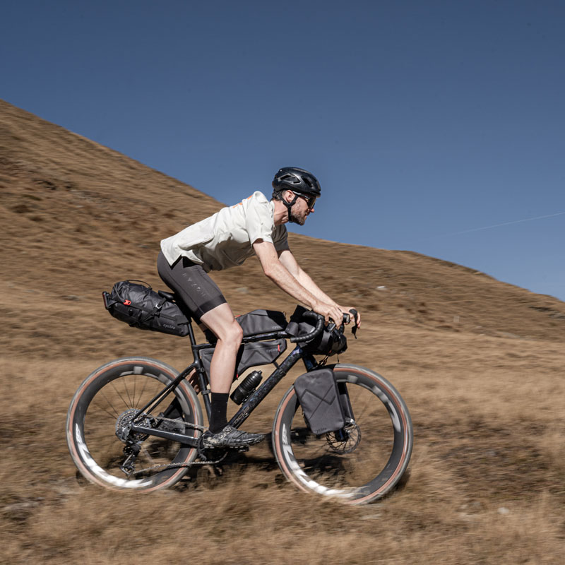 FRAME BAG LARGE / 02 ist die größere Alternative zu FRAME BAG / 02. Sie verfügt über 3,6 Liter Stauvolumen und somit mehr Platz für zentral und aerodynamisch platziertes Gepäck (unter anderem Werkzeug, Trinkblase, Powerbank, Schloss), auf das tagsüber zugegriffen wird. Bei der Konstruktion wurde Wert daraufgelegt, dass auch bei kleinerer Rahmengröße neben FRAME BAG LARGE / 02 noch eine Trinkflasche Platz im Rahmendreieck findet. Die Tasche ist in zwei große Fächer, oben und unten, unterteilt, hat ein weiteres Seitenfach für Kreditkarten, Ausweis oder Bargeld, zwei Netz-Innentaschen für Kleinteile sowie einen Schlüsselhaken. An der Vorderseite der Tasche findet sich eine abgedeckte Öffnung für die Durchführung von Stromkabeln oder einem Trinkschlauch. FRAME BAG LARGE / 02 ist trotz des großen Volumens und der diversen Features extrem leicht und damit perfekt geeignet für längere Abenteuer oder Ultra-Distanzrennen.