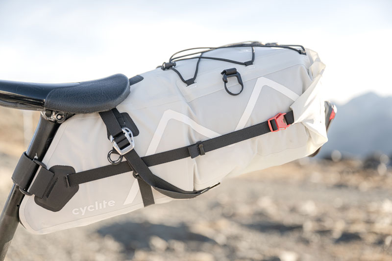 SADDLE BAG / 02 ist der Klassiker unter den Bikepacking-Taschen. Hier lässt sich im Windschatten des Fahrers richtig viel Gepäck unterbringen. Typischerweise neigen solche Taschen aber dazu, besonders im Wiegetritt hin und her zu schwingen. Daher haben wir der stabilen Anbringung besonderes Augenmerk gewidmet. Mittels Aluminiumhaken und einem untersetzten Gurtsystem wird die Tasche gegen jede Sattelschiene einzeln verspannt. Auch dank der mittigen Carbon-Leiste entsteht so ein sehr stabiler, ultra-leichter Gepäckraum. Zum steiferen Packen mit dem Rollverschluss besitzt die Tasche ein Ventil als Luftauslass. Auf der Oberseite können unter elastischen Straps weitere Ausrüstungsgegenstände fixiert werden. Anbringungsmöglichkeiten für das Rücklicht sind ebenfalls vorhanden. Die SADDLE BAG / 02 eignet sich vor allem dazu, Dinge, auf die man während der Fahrt nicht unbedingt zugreifen muss, wie Schlafsack, Toilettenartikel und Wechselbekleidung, unterzubringen.
