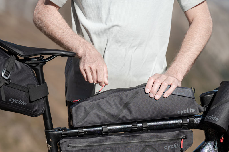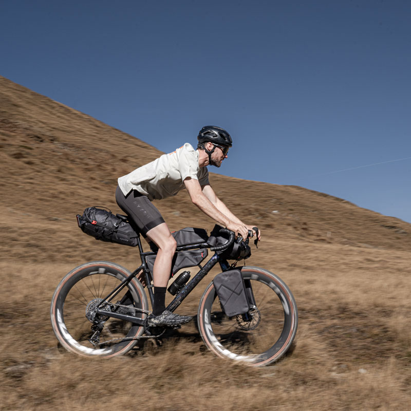 TOP TUBE BAG LARGE / 02 ist die größere Schwester von TOP TUBE BAG / 03 und mit 2,2 Litern Volumen auf dem Oberrohr die Lösung für all jene, die längere Zeit unterwegs sind, in ihrem Rahmen keinen Platz für eine FRAME BAG haben oder die sich den ‚Luxus‘ von mehr Stauraum mit direktem Zugriff während der Fahrt wünschen.