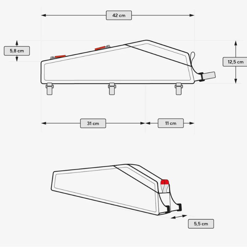 Die TOP TUBE BAG LARGE benötigt einen Mindestabstand Steuerkopf-Sattelstütze von 44 cm. Sie ist mit der FRAME BAG (LARGE) und den meisten Rahmentaschen kompatibel, da die Position der Fixierungsgurte verschoben werden kann.