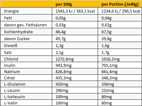 Maltodextrin, Fructose, Glucose oder Dextrose, Säuerungsmittel Zitronensäure, Inulin, Natriumchlorid, Kaliumcitrat, Weizenproteinhydrolysat, L-Glutamin, L-Leucin, Magnesiumcarbonat, L-Isoleucin, L-Valin.