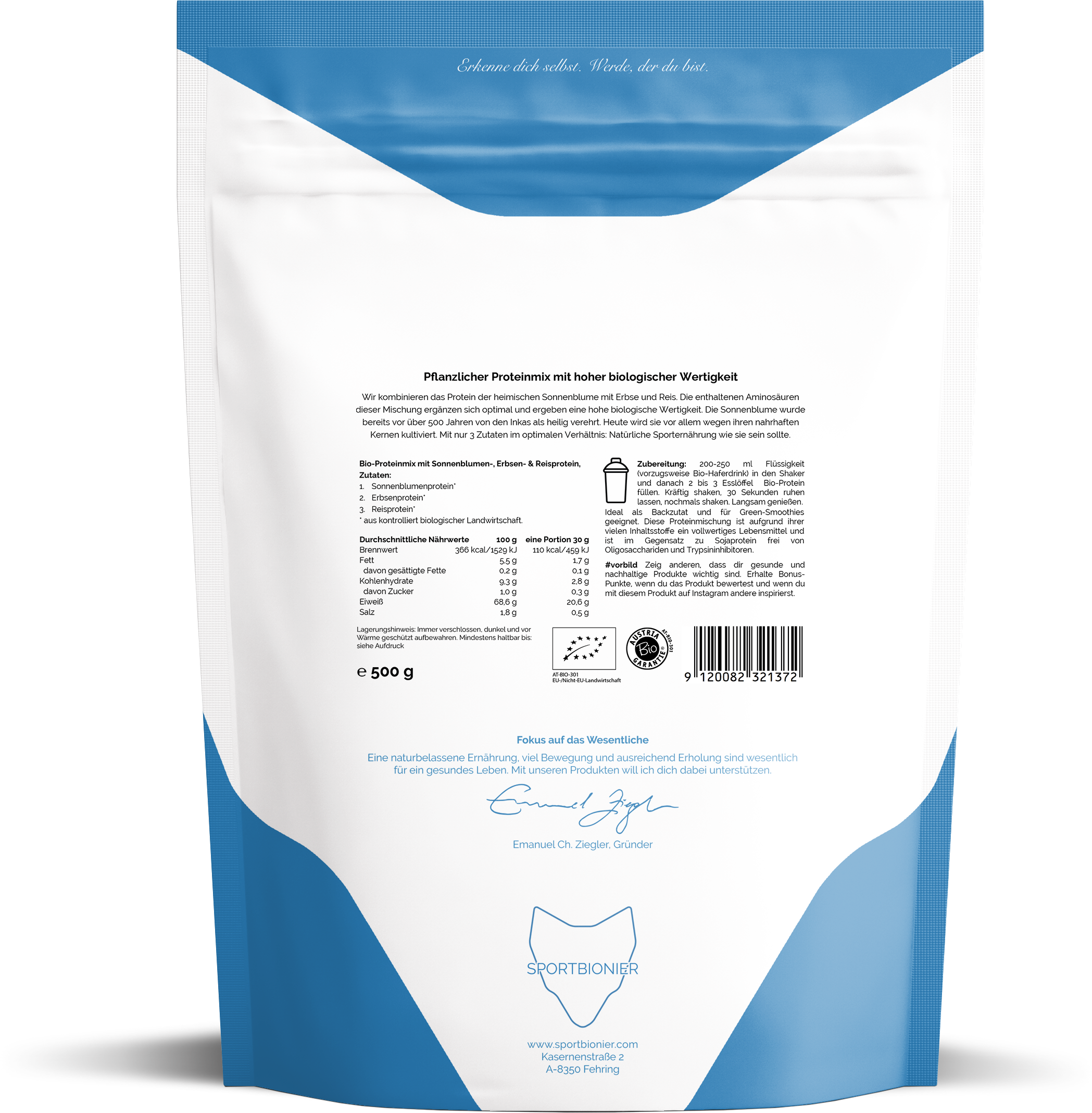 Sportbionier kombiniert das Protein der Sonnenblume mit Erbse und Reis. Die enthaltenen Aminosäuren dieser Mischung ergänzen sich optimal.
