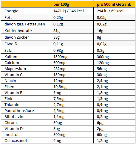 Maltodextrin, Fruktose, Dextrose, Süßungsmittel Isomaltulose***, Magnesiumkaliumcitrat, Säuerungsmittel Citronensäure, Säuerungsmittel Weinsäure, Johannisbeerensaftpulver, Calciumcarbonat, Aroma, Kaliumcitrat, Anthocyankonzentrat (Extrakt aus Rottrauben), Dinatriumphosphat, Magnesiumcarbonat, Inosit, Süßungsmittel Natriumcyclamat, Natriumchlorid, L-Ascorbinsäure, Octacosanol 5% Complex, Mittelkettige Triglyceride aus Kokos, Eisengluconat, Verdickungsmittel Xanthan, Süßungsmittel Natriumsaccharin, Zinkgluconat, dl-alpha Tocopherylacetat, Niacinamid, Thiaminhydrochlorid, Calcium-D-pantothenat, Saccharose, Pyridoxolhydrochlorid, Trägerstoff Gummi arabicum, Riboflavin, Maisstärke, Chrom-III-chlorid Hexahydrat, Cholecalciferol.