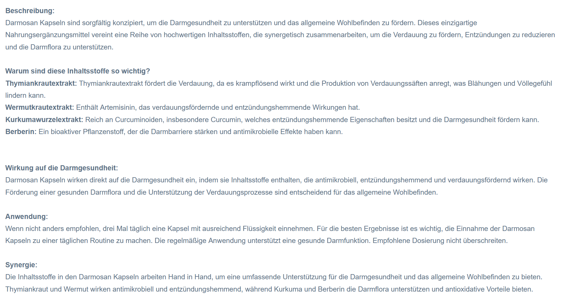 Die Darmosan Kapseln unterstützen die Darmgesundheit und fördern die Verdauung. Durch die Inhaltsstoffe haben sie entzündungshemmende Eigenschaften und eine antimikrobielle Wirkung. Eine gesunde Darmflora und das Immunsystem wird gefördert, auch die Leberfunktion wird unterstützt.