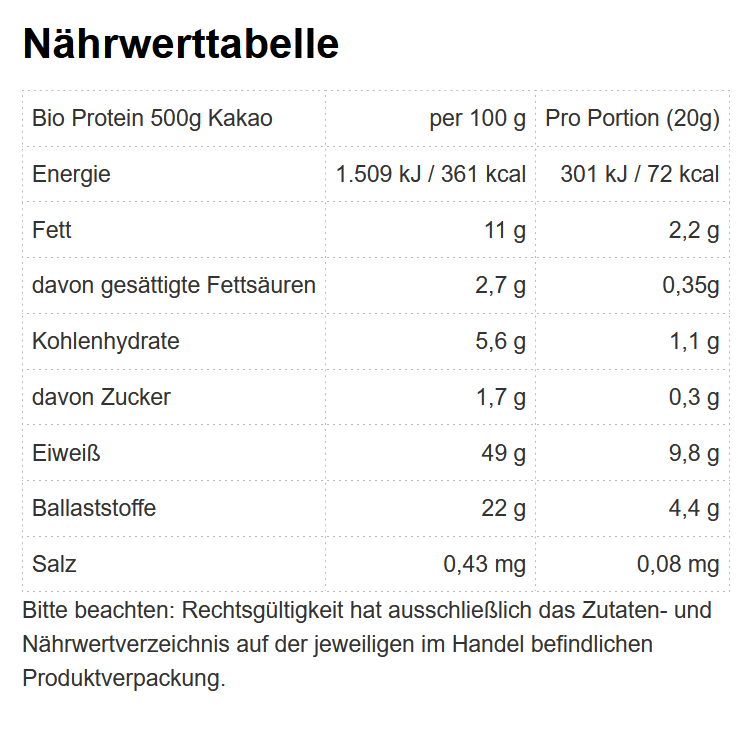 40% Kürbiskern Protein Pulver geröstet*, 20% Sonnenblumenkern Protein Pulver roh*, 20% Kakao Pulver entölt*, 10% Hanf Protein Pulver roh*, 10% Lein Protein Pulver roh*