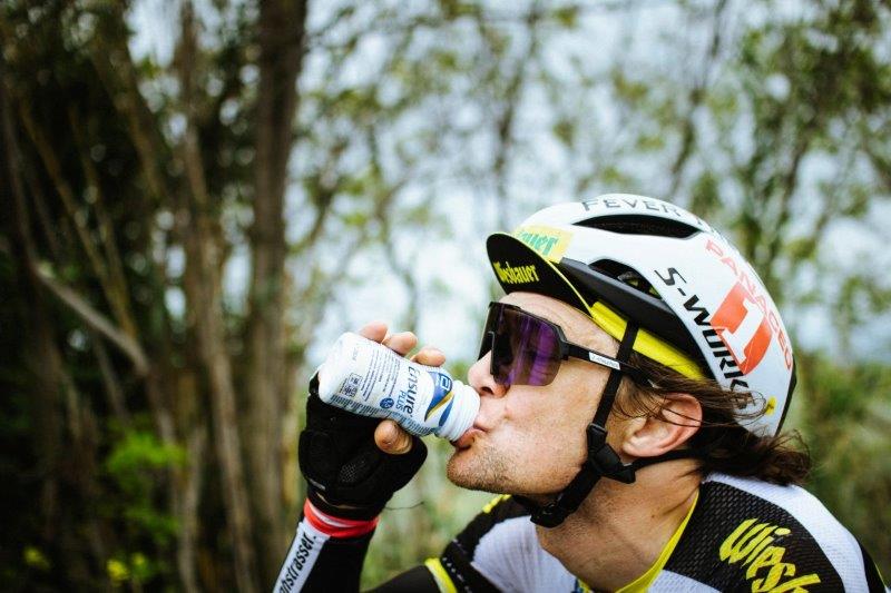 Wenn die Ausfahrten länger werden und der Energiebedarf steigt, Ensure in die Trinkflasche und mit Wasser auffüllen! In eine 750ml-Trinkflasche passen 3 Flaschen Ensure, das ergibt 900kcal und reicht für viele Stunden im Sattel!