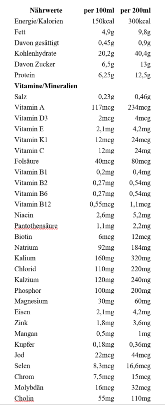 Eine Packung zu 200 ml enthält 300 kcal und ist reich an Kohlehydraten, Fett, Eiweiß, Mineralstoffen, Spurenelementen und Vitaminen.